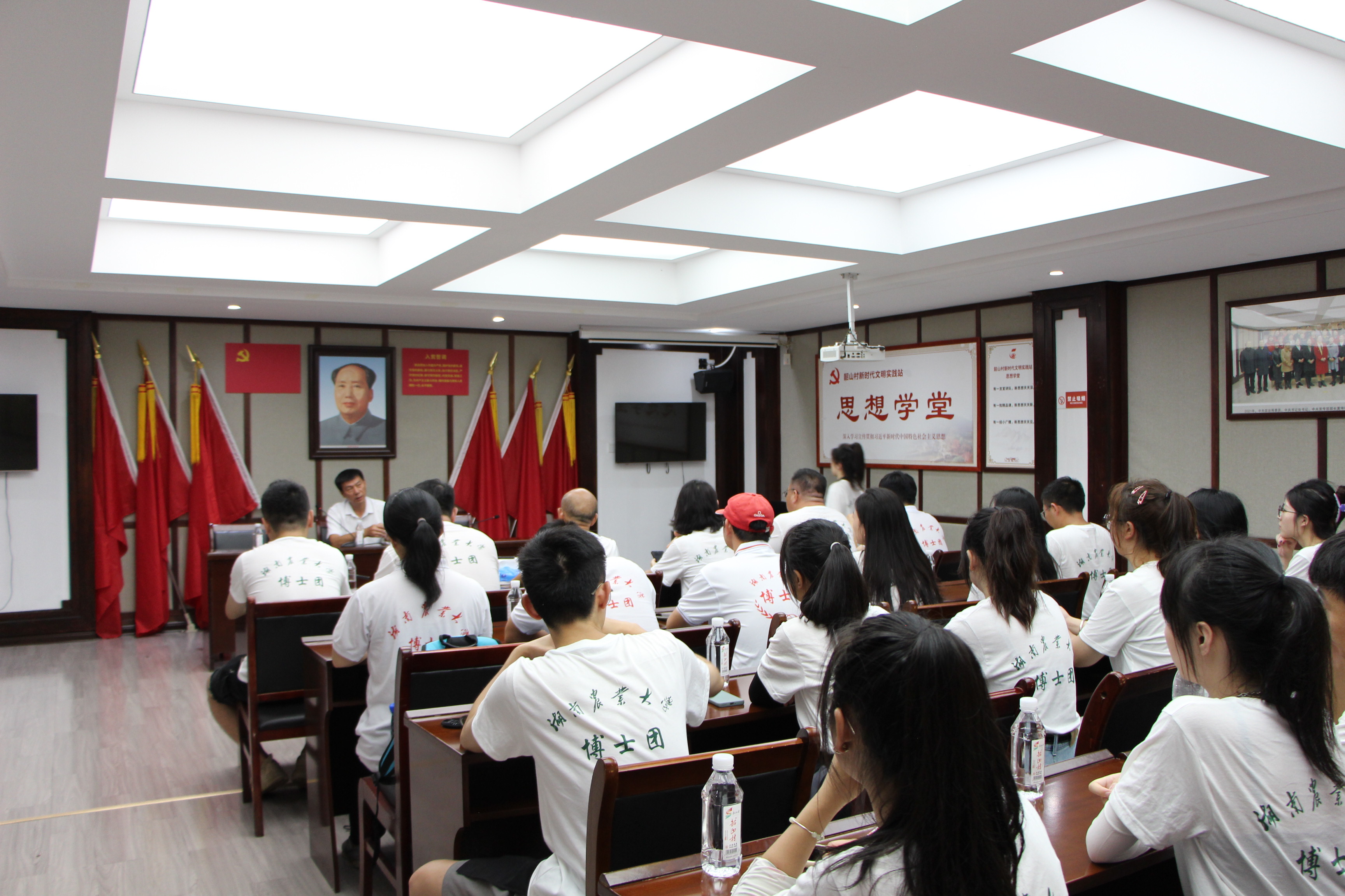 与会人员围绕主题党课探讨学习,在实践中贯彻落实党的二十大精神。师生党员一同走进韶山村党支部特别陈列纪念馆,了解毛泽东“阁楼建特支”的故事,追寻红色足迹,领悟红色革命历史文化。覃红燕书记强调,我们要深刻把握以“为有牺牲多壮志、敢教日月换新天”为内核的韶山精神,以“三牛精神”服务三农,将论文写在大地上,将成果装进农民口袋里!