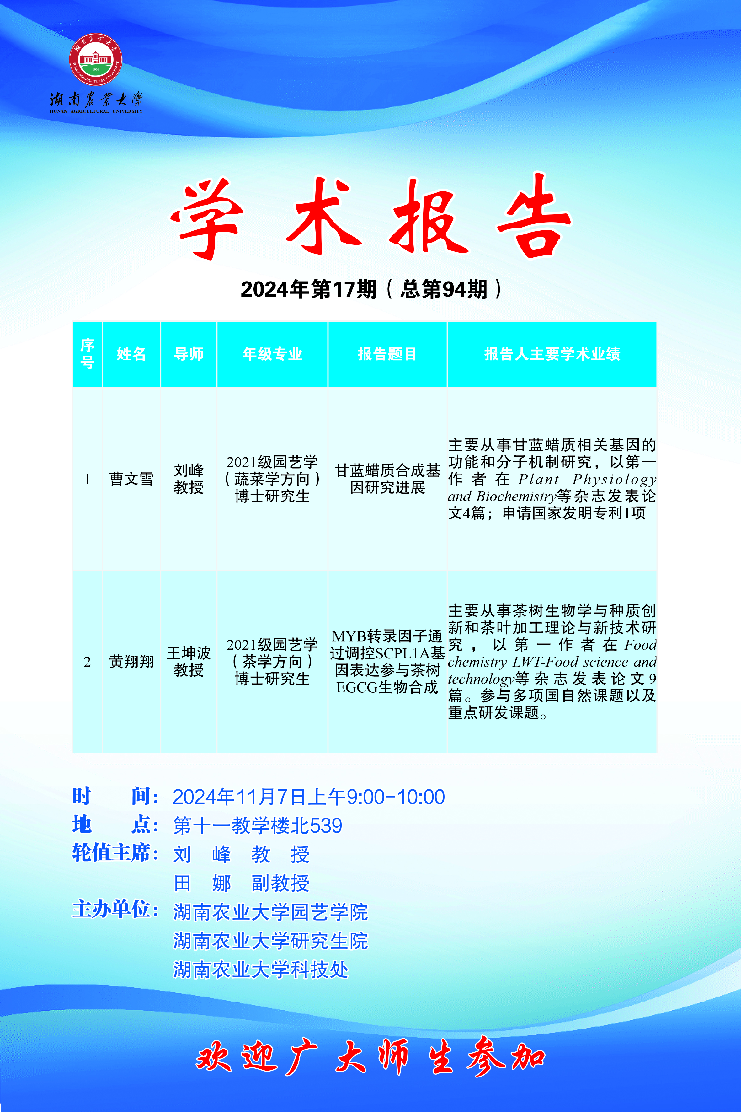 园艺讲坛第九十四期-博学讲坛:甘蓝蜡质合成基因研究进展;MYB转录因子通过调控SCPL1A基因表达参与茶树EGCG生物合成