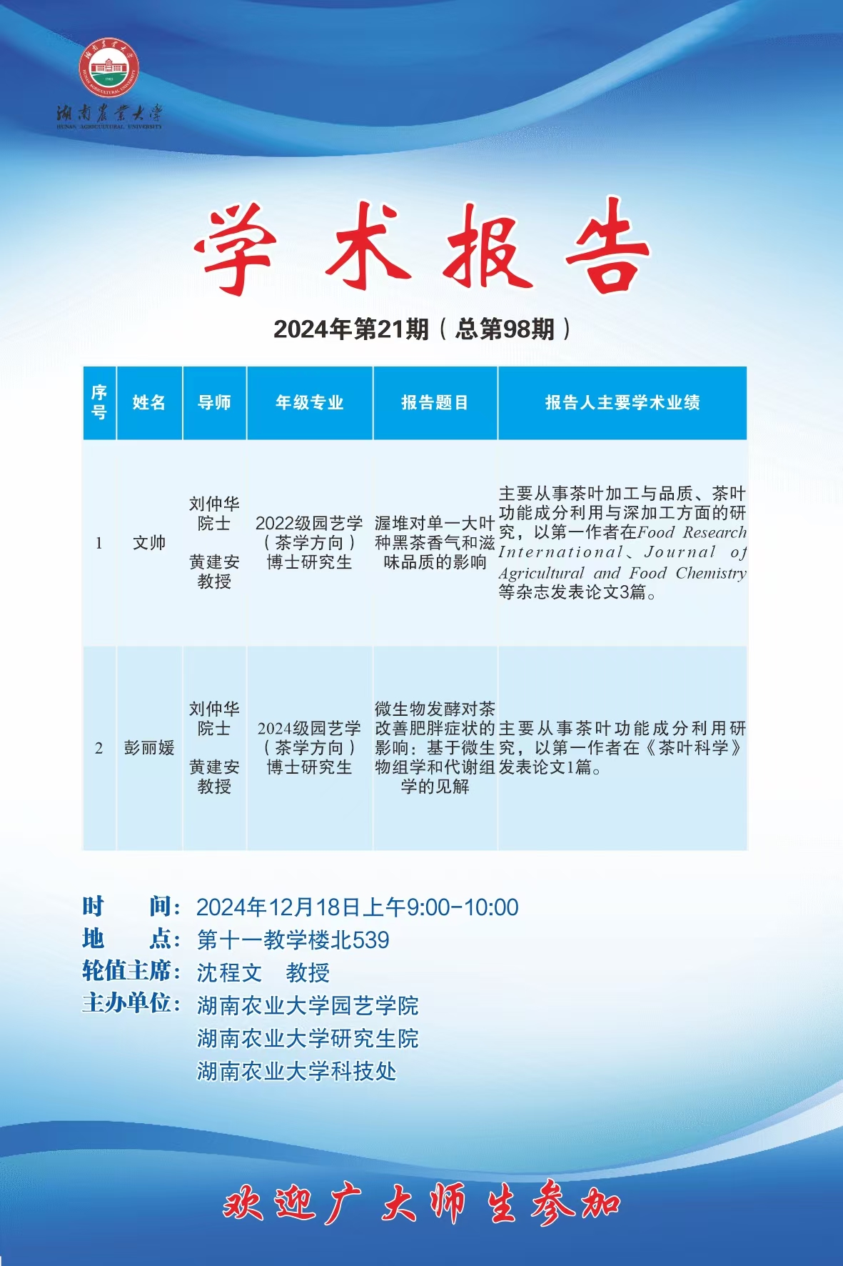 园艺讲坛第九十八期-博学讲坛:渥堆对单一大叶种黑茶香气和滋味品质的影响;微生物发酵对茶改善肥胖症状的影响:基于微生物组学和代谢组学的见解