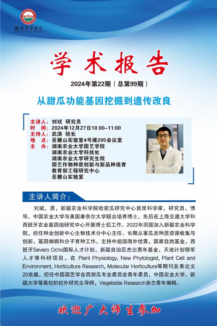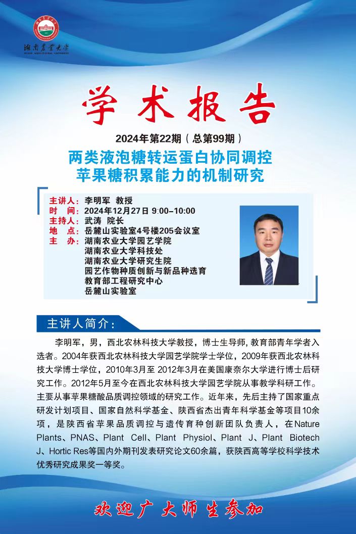 园艺讲坛第九十九期-名师讲坛:两类液泡糖转运蛋白协同调控苹果糖积累能力的机制研究;从甜瓜功能基因挖掘到遗传改良