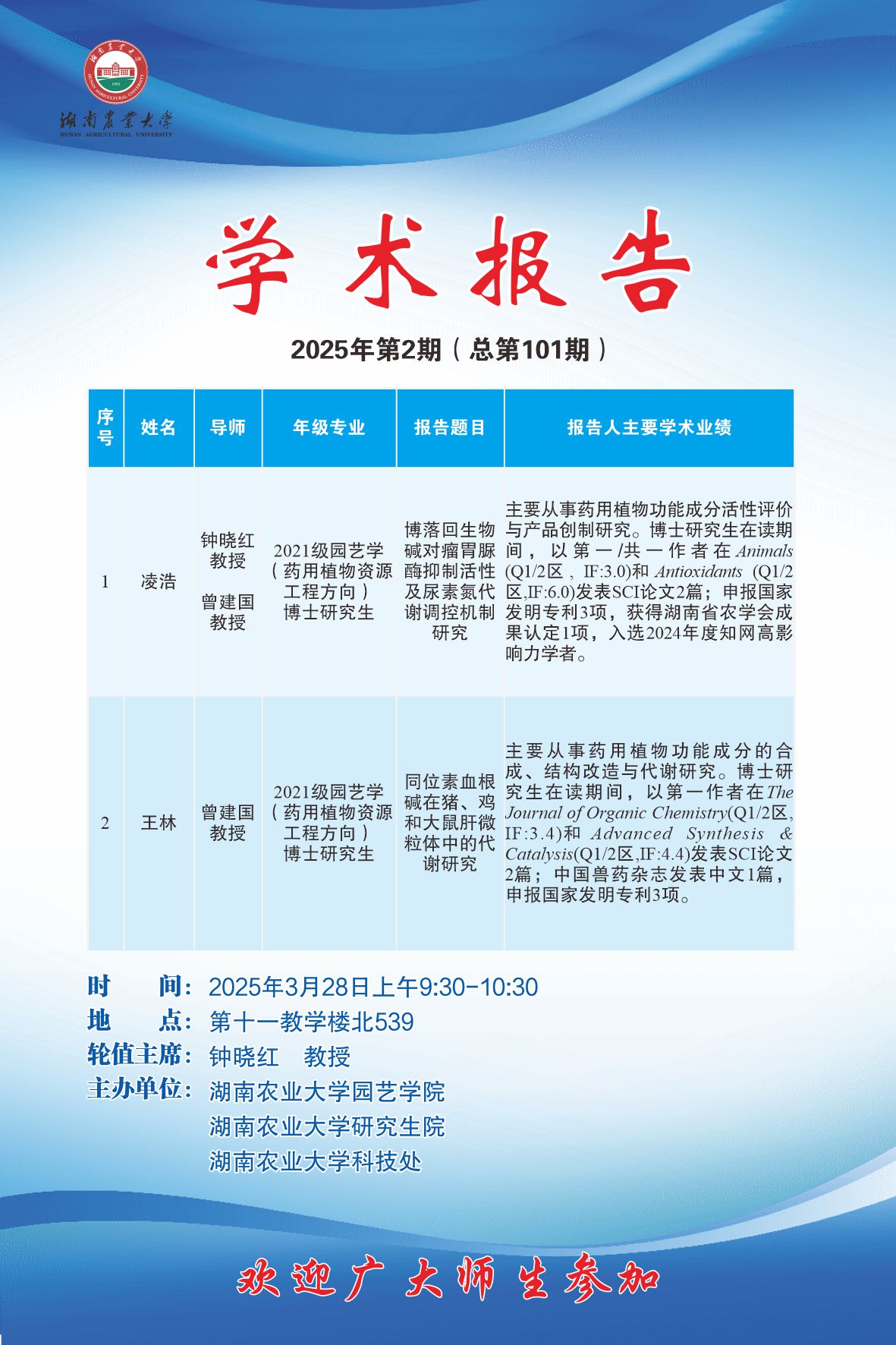 园艺讲坛第101期-博学讲坛:博落回生物碱对瘤胃脲酶抑制活性及尿素氮代谢调控机制研究;同位素血根碱在猪、鸡和大鼠肝微粒体中的代谢研究